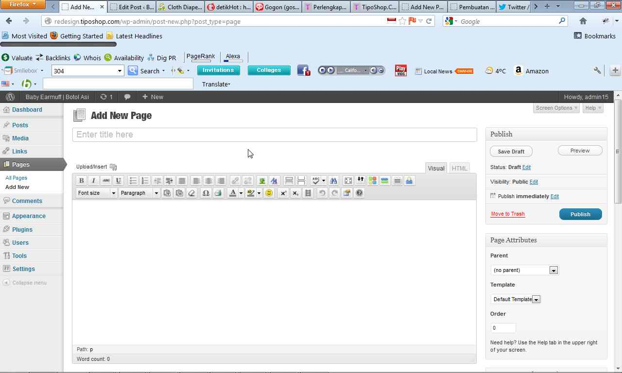 - Akan muncul halaman teks editor seperti pada langkah membuat postingan baru. Isikan judul beserta isi halaman, template biarkan saja default. Lalu publish untuk mempubliksikannya.
