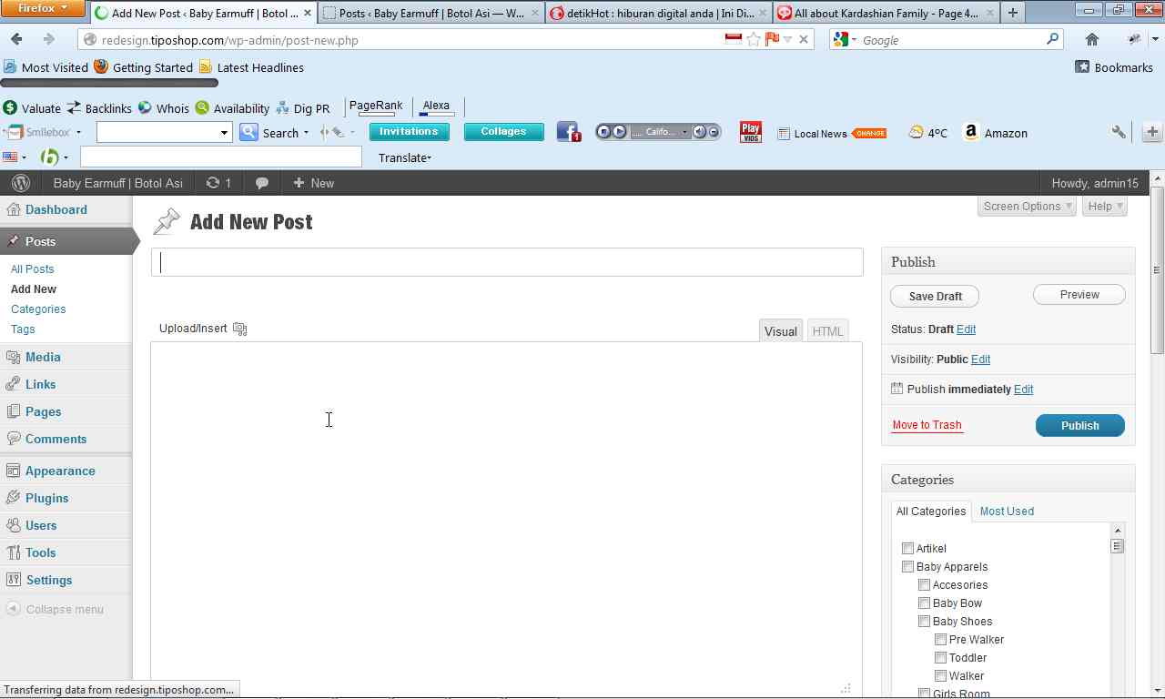 - Jika Anda menulis melalui navigasi Post, Langsung pilih Add New. Akan muncul halaman mirip teks editor mirip dengan pengolahan kata Ms Word. Isikan judul postingan, kemudian tuliskan artikel yang akan anda posting. Pengkategorian diperlukan untuk memudahkan pencarian sesuai dengan tema yang disampaikan.