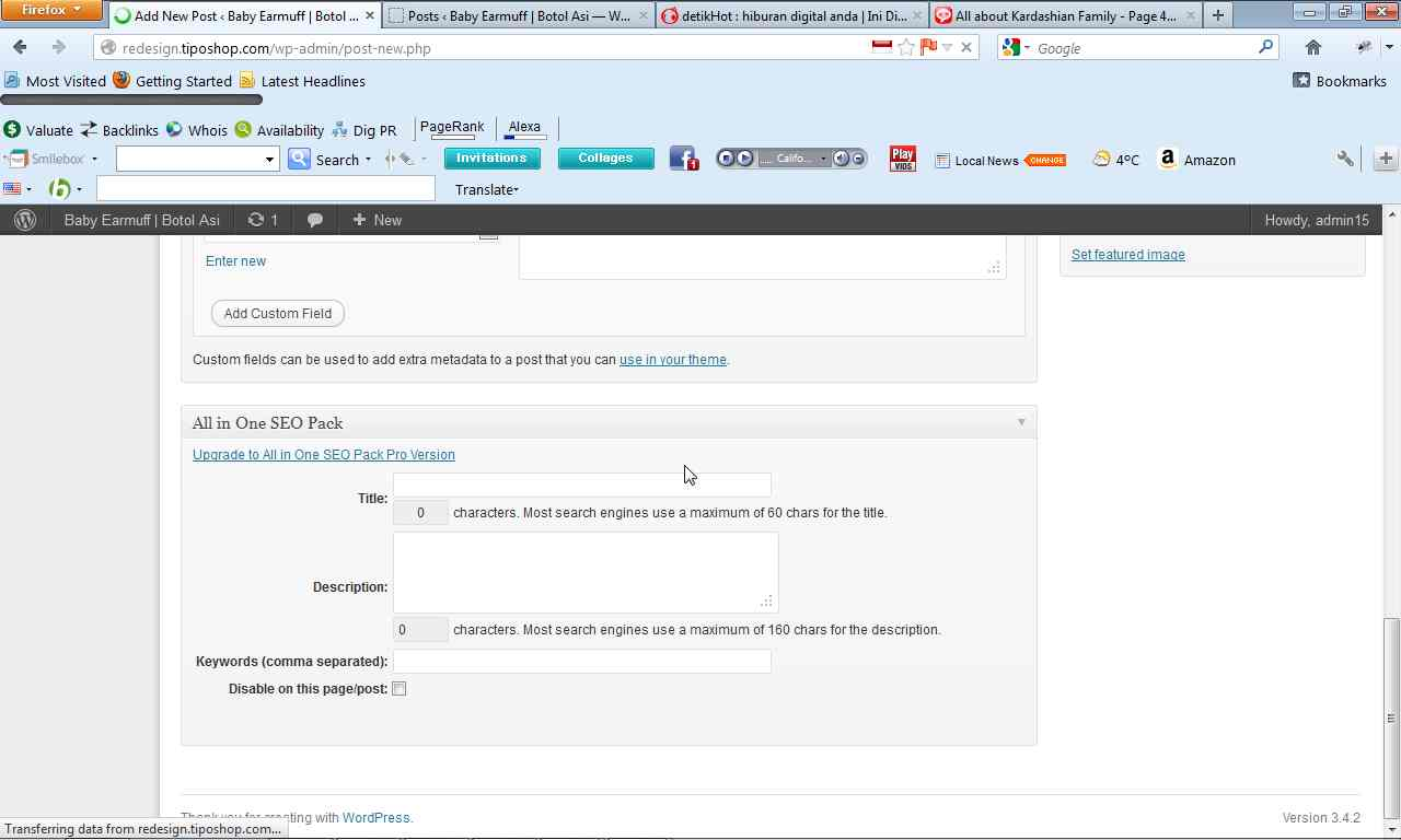 - Custom Fields untuk mengoptimalkan mesin pencari mengenal kata dan kalimat yang dominan atau biasa dikenal dengan SEO (Search Engine Optimization). Anda dapat mengisi dengan tiga entri :